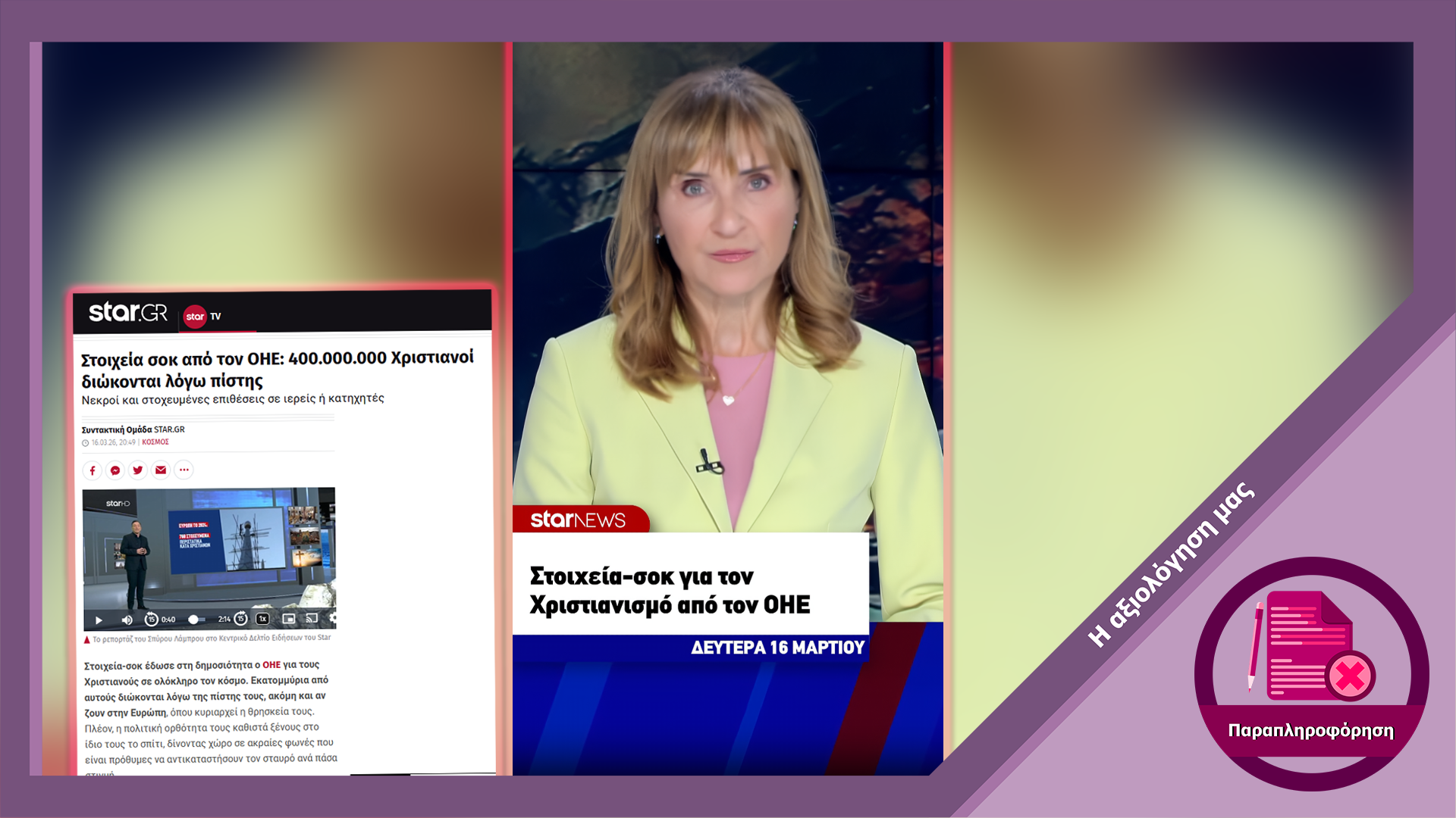 Στις 16 Μαρτίου 2026, το star.gr δημοσίευσε άρθρο με τίτλο «Στοιχεία σοκ από τον ΟΗΕ: 400.000.000 Χριστιανοί διώκονται λόγω πίστης». Στο ίδιο κείμενο υποστηρίζεται ότι μόνο το 2025 σκοτώθηκαν 5000 Χριστιανοί, ότι στην Ευρώπη σημειώθηκαν 760 στοχευμένες επιθέσεις σε ιερείς ή κατηχητές και ότι χιλιάδες Χριστιανοί φυλακίζονται σε περίπου 30 χώρες. Το ρεπορτάζ συμπληρώνεται από σχόλια καλεσμένων που συνδέουν τα παραπάνω στοιχεία με την πολιτική ορθότητα, τη μετανάστευση και το Ισλάμ. Την είδηση αναπαρήγαγαν και πολυάριθμα ελληνικά μέσα ενημέρωσης αναφέροντας τον ΟΗΕ ως την πηγή των δεδομένων.