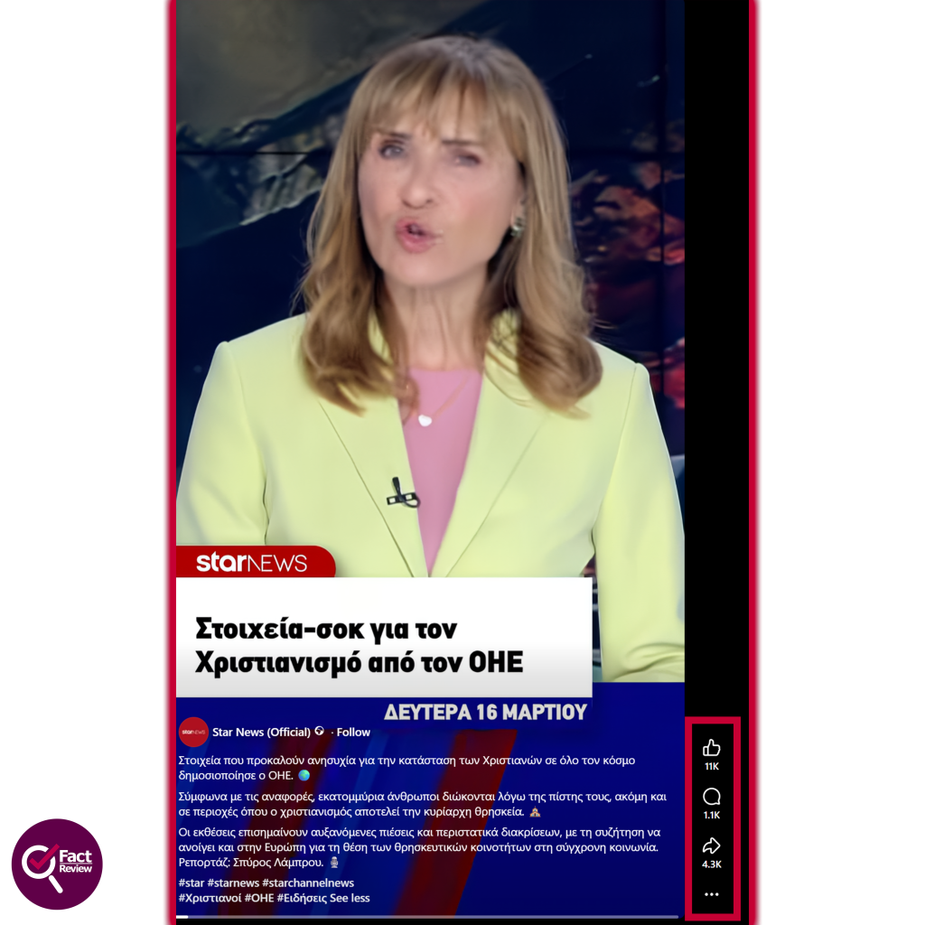 Σε ρεπορτάζ που προβλήθηκε στον σταθμό Star, και παράλληλα δημοσιεύθηκε στο star.gr τον Μάρτιο του 2026, αποδόθηκαν στον ΟΗΕ στοιχεία σύμφωνα με τα οποία 400 εκατομμύρια Χριστιανοί διώκονται λόγω πίστης, περίπου 5000 σκοτώθηκαν το 2025, στην Ευρώπη καταγράφηκαν 760 στοχευμένες επιθέσεις σε ιερείς ή κατηχητές και περισσότεροι από 2300 άνθρωποι βρίσκονται στη φυλακή για τη θρησκεία τους. Η ανεξάρτητη εξέταση των διαθέσιμων πηγών δεν επιβεβαιώνει ότι πρόκειται για επίσημη στατιστική δημοσίευση του ΟΗΕ. Αντίθετα, δείχνει ότι το ρεπορτάζ συμπυκνώνει και αναμειγνύει στοιχεία από την διεθνή ευαγγελική χριστιανική οργάνωση “Open Doors”, τον Οργανισμό για την Ασφάλεια και τη Συνεργασία στην Ευρώπη (OSCE), το Γραφείο για τους Δημοκρατικούς Θεσμούς και τα Ανθρώπινα Δικαιώματα (ODIHR), την Επιτροπή των ΗΠΑ για τη Διεθνή Θρησκευτική Ελευθερία (USCIRF) και δημόσιες τοποθετήσεις της Αγίας Έδρας σε παράλληλη εκδήλωση του Συμβουλίου Ανθρωπίνων Δικαιωμάτων στη Γενεύη.