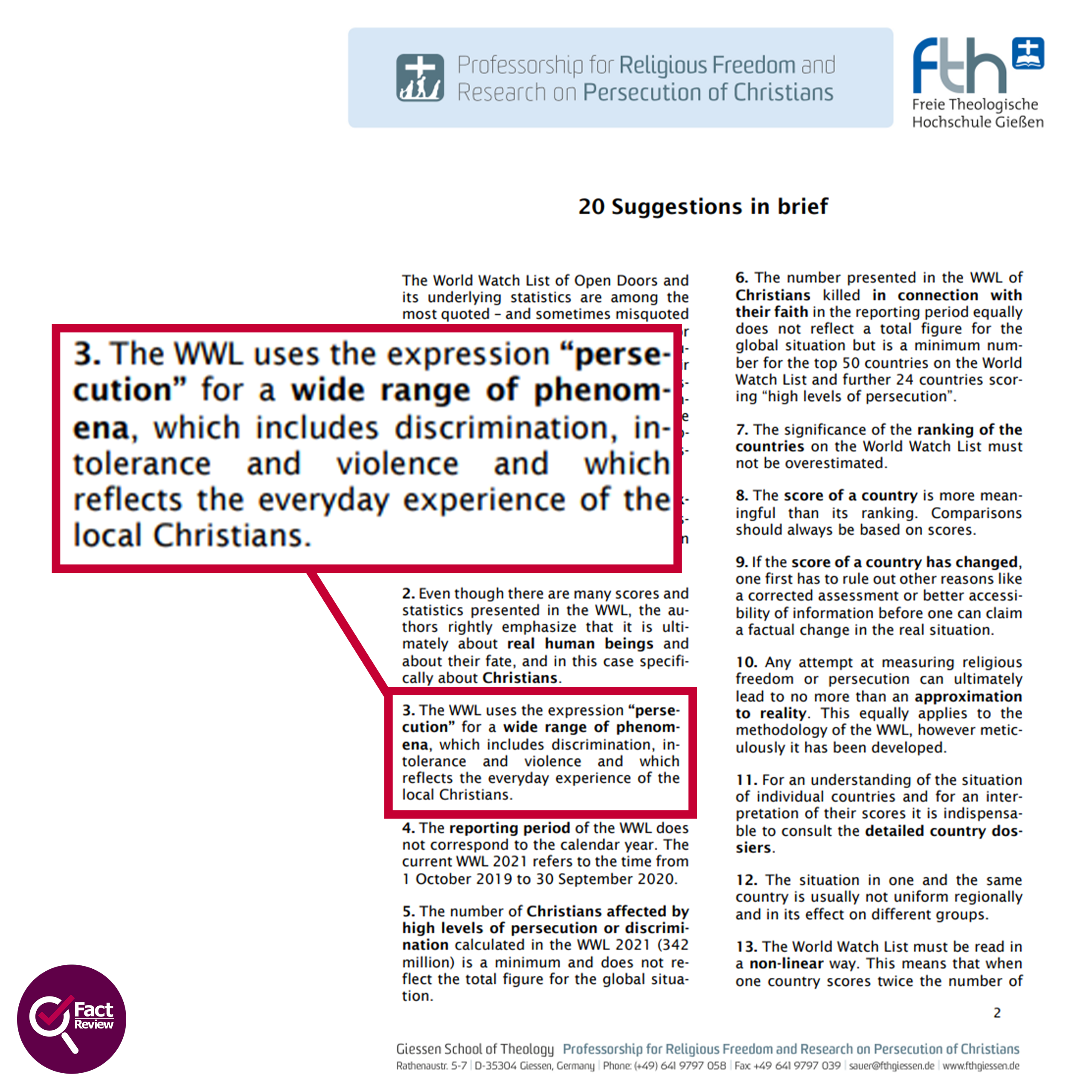 Στα έγγραφα της μεθοδολογίας της και στη σχετική καθοδήγηση για την ορθή χρήση των δεδομένων, η Open Doors εξηγεί ότι χρησιμοποιεί ευρύ ορισμό της “δίωξης”. Στο πλαίσιο αυτό εντάσσει όχι μόνο φυσική βία, αλλά και διακρίσεις, διοικητικούς περιορισμούς, κοινωνική πίεση, αποκλεισμό από την εκπαίδευση ή την εργασία, περιορισμούς στη λατρεία και άλλες μορφές εχθρότητας. Η ίδια η οργάνωση διευκρινίζει επίσης ότι στον όρο «Χριστιανοί» περιλαμβάνει ανθρώπους που αυτοπροσδιορίζονται ως Χριστιανοί ή ανήκουν σε χριστιανικές κοινότητες με βάση ευρύτερα ομολογιακά κριτήρια.