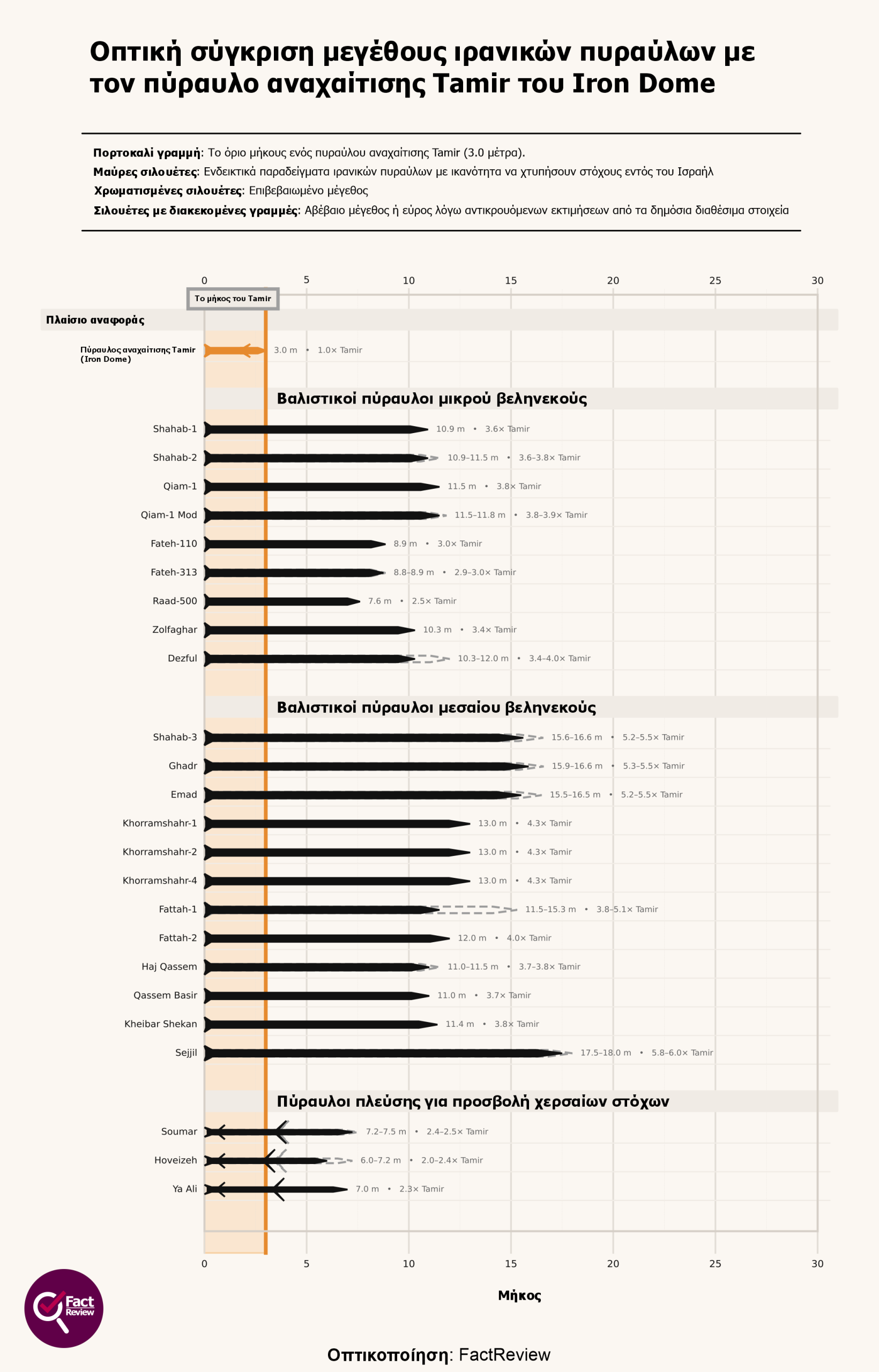 Συμπληρωματικά προς τα παραπάνω, δημιουργήσαμε γράφημα σύγκρισης μεταξύ γνωστών τύπων ιρανικών πυραύλων και του πυραύλου αναχαίτισης Tamir, αντλώντας στοιχεία από δημόσια διαθέσιμες πηγές όπου αυτό ήταν εφικτό. Αν και η σύγκριση αυτή δεν μπορεί να θεωρηθεί απολύτως ακριβής ούτε αρκεί από μόνη της για την ταυτοποίηση του αντικειμένου, βοηθά σε μια ενδεικτική εκτίμηση του μεγέθους του. Από αυτή προκύπτει ότι οι αντίστοιχοι ιρανικοί πύραυλοι είναι σημαντικά μεγαλύτεροι, κάτι που συνάδει με τα διαθέσιμα πλάνα και τις φωτογραφίες του εξεταζόμενου περιστατικού.