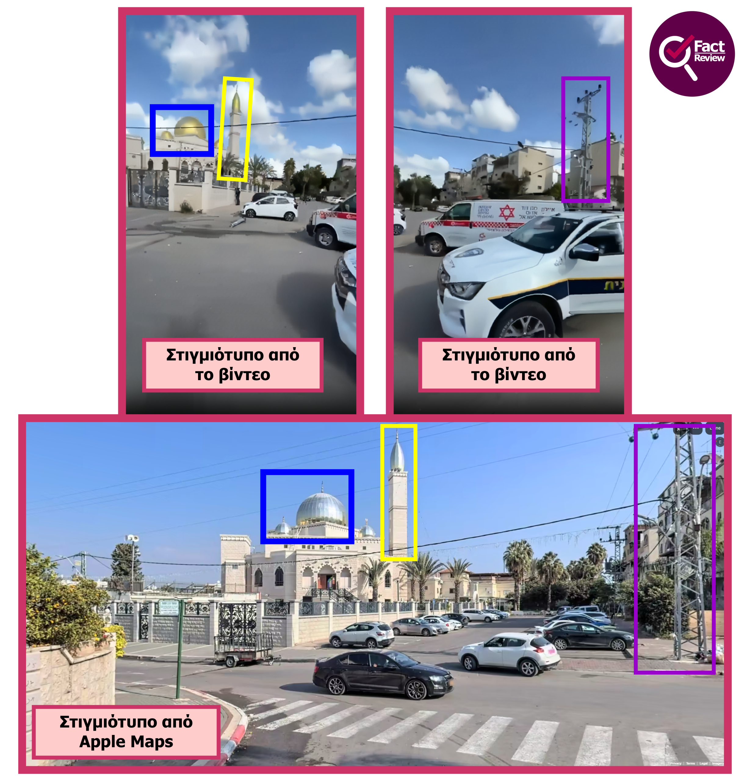 Αρχικά, το σημείο που δείχνει το επίμαχο βίντεο, σύμφωνα με σχετική ανάλυση που δημοσίευσε ο οργανισμός Συλλογής Πληροφοριών από Ανοικτές Πηγές (OSINT) GeoConfirmed, την οποία επιβεβαιώσαμε και μέσω Apple Maps, είναι το τζαμί Masjid al-Nur στην πόλη Lod, στο Ισραήλ.